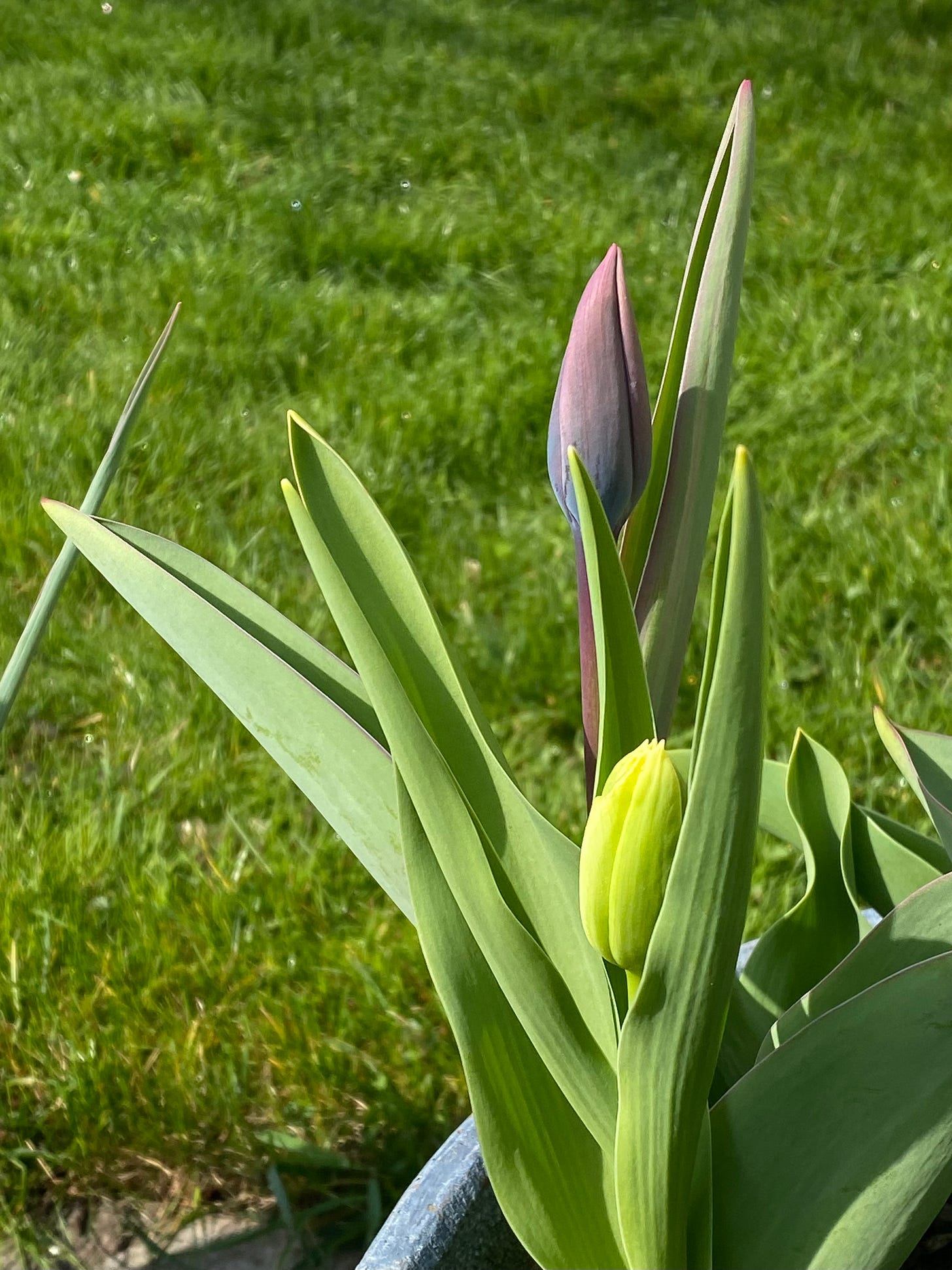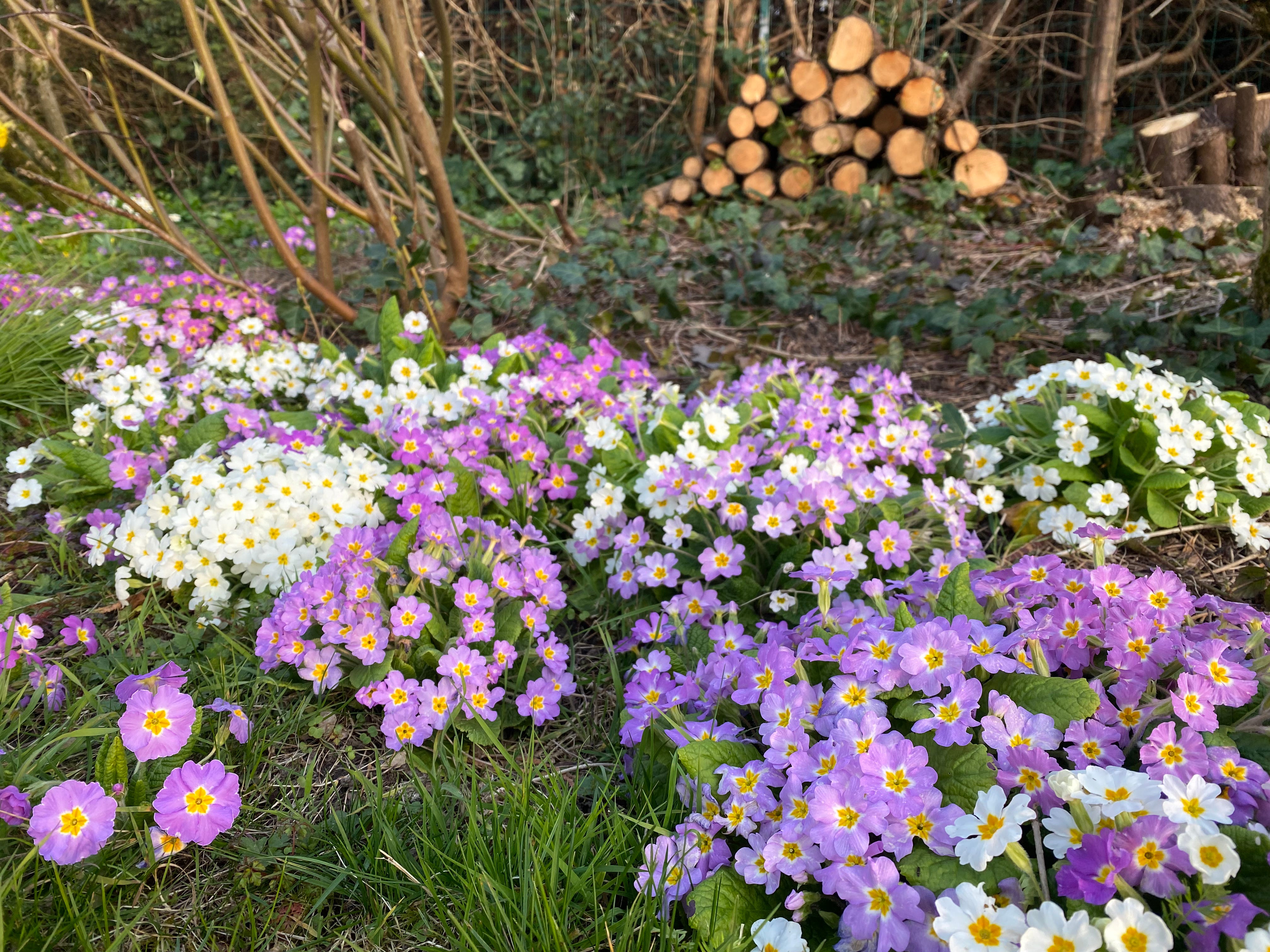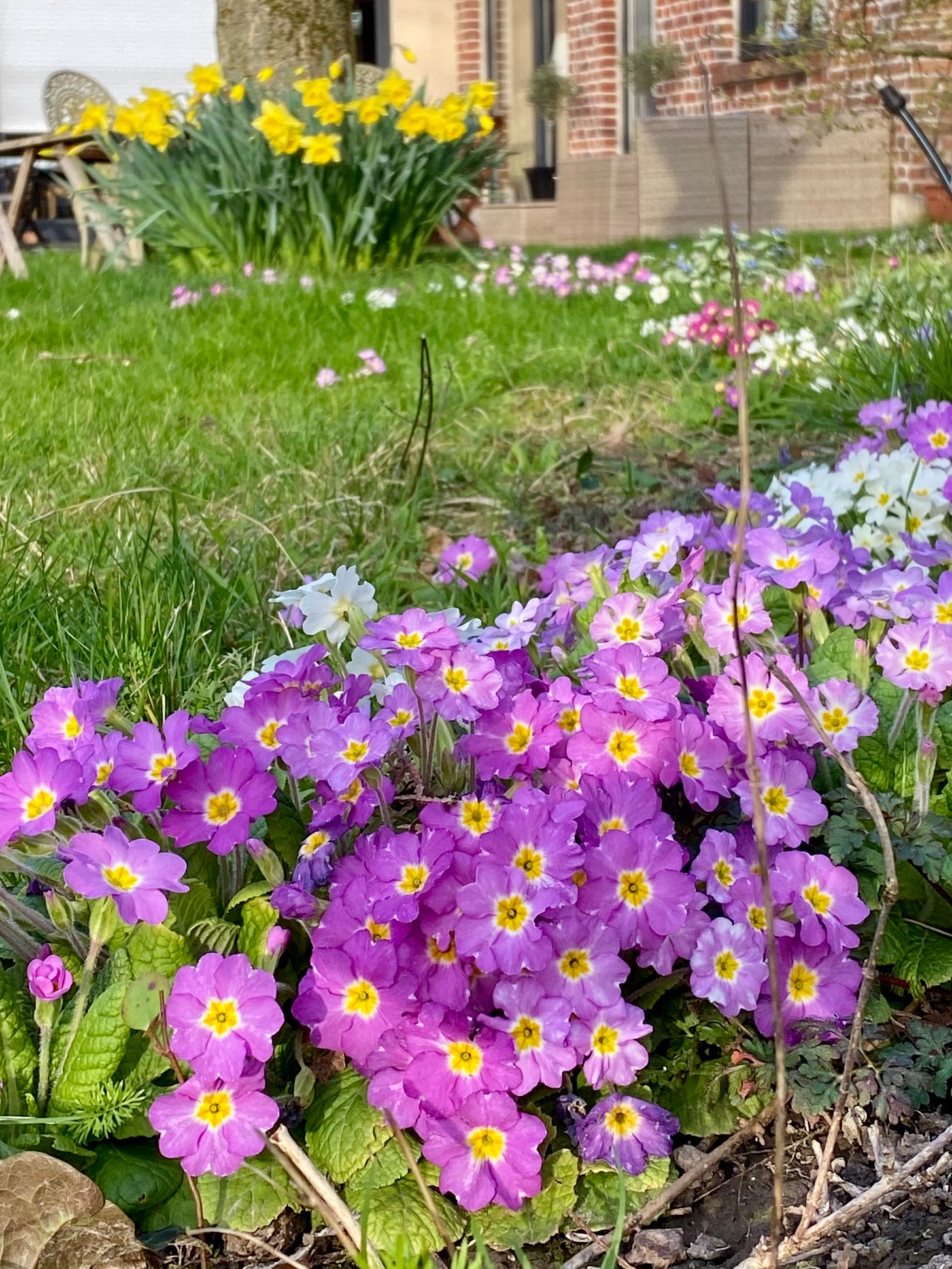 Pictured above and below: Under the still-bare branches of the trees and most shrubberies, certain corners of our garden are a riot of color. The daffodils are their usual brash selves, the primroses are attempting a hostile takeover, the maroon hellebores are just pleased that they got noticed, the crimson camellia is hitting its stride, and some of the tulips (planted at the end of January!) are going to beat Easter. They shine in the low-angled sunlight like painted eggs.